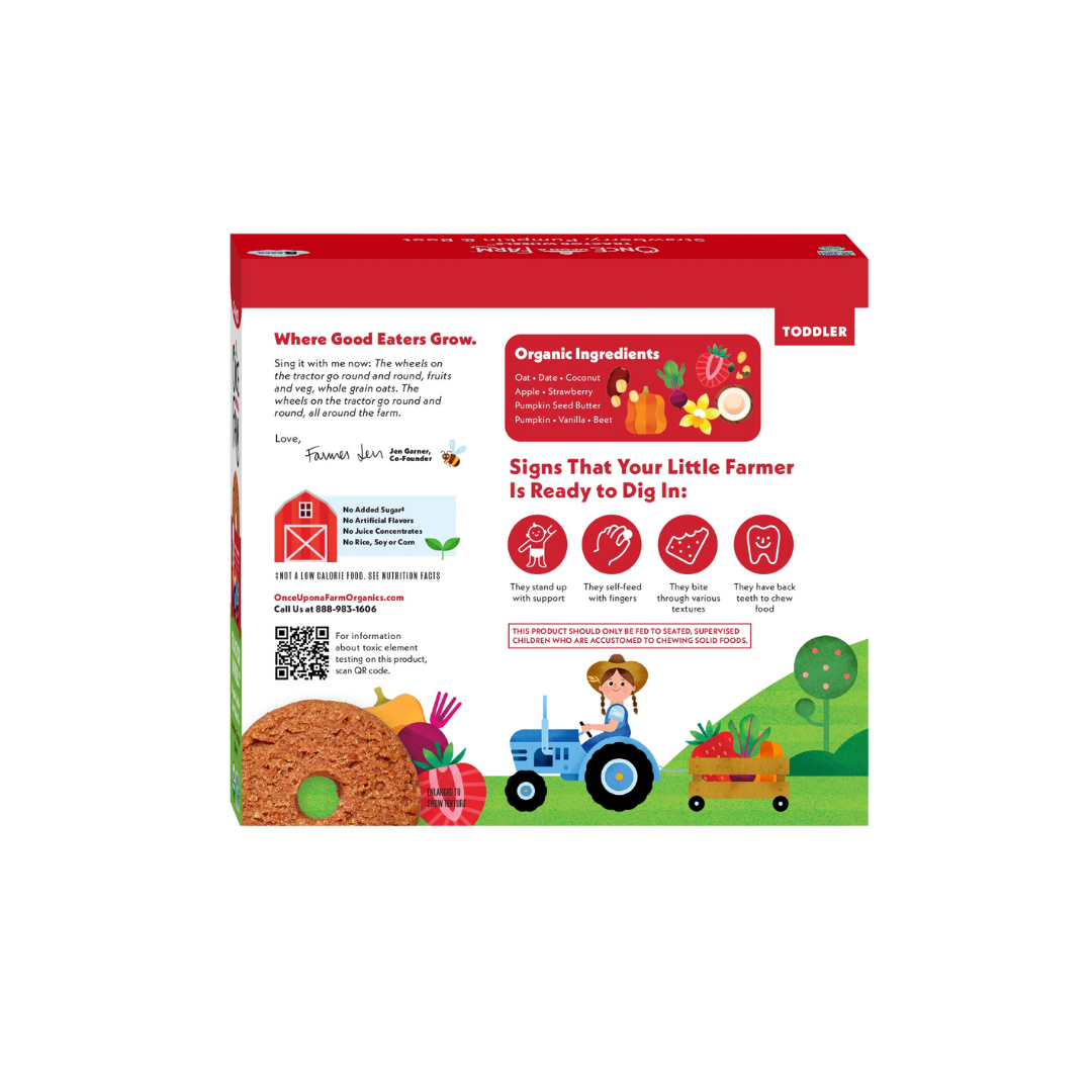 A well-rounded organic toddler snack: 100% whole grain oats, real fruits and veggies, and no added sugar, baked into a snackable tractor wheels shaped bar that fits perfectly in little hands.